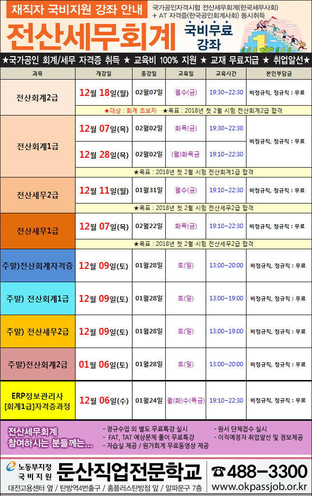 11월~2월 재직자 전산세무회계/ERP회계/세무회계 실무 강좌 안내