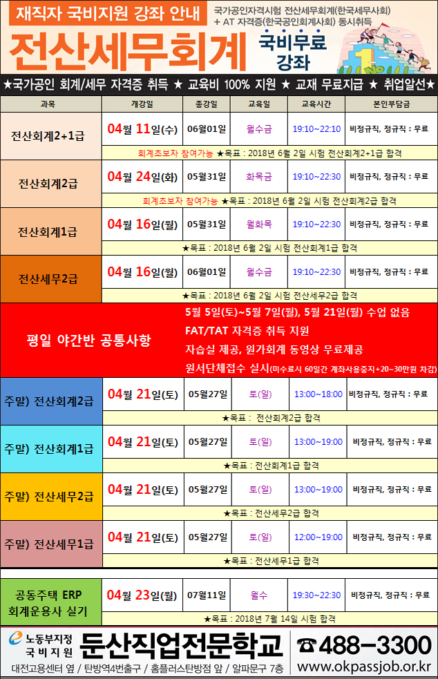 2월~4월 재직자 전산세무회계/ERP회계/세무회계 실무 강좌 안내