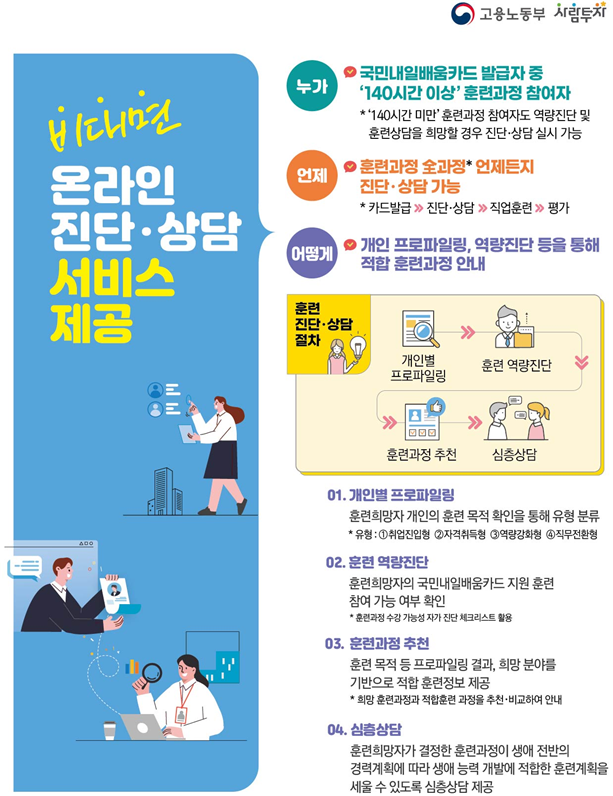 이에 국민내일배움카드 발급자 중 ' 140시간 이상 ' 훈련과정 참여자의 경우에도 고용센터에 방문하여 상담하지 않고, HRD-Net 에서 역량진단 및 훈련 진단 · 상담을 통해 ' 비대면 상담 ' 으로 진행 가능함을 알려드립니다 .