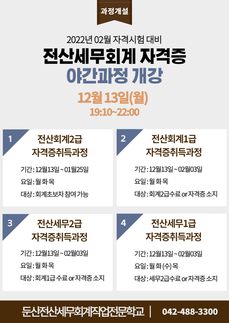 2022년 2월에 시행하는 제100회 전산세무회계 자격시험 대비 12월 야간과정을 개설하여