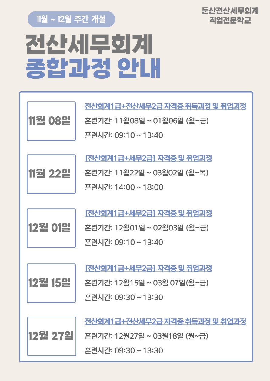 11월~12월 전산세무회계 종합과정을 아래와 같이 개설했습니다.