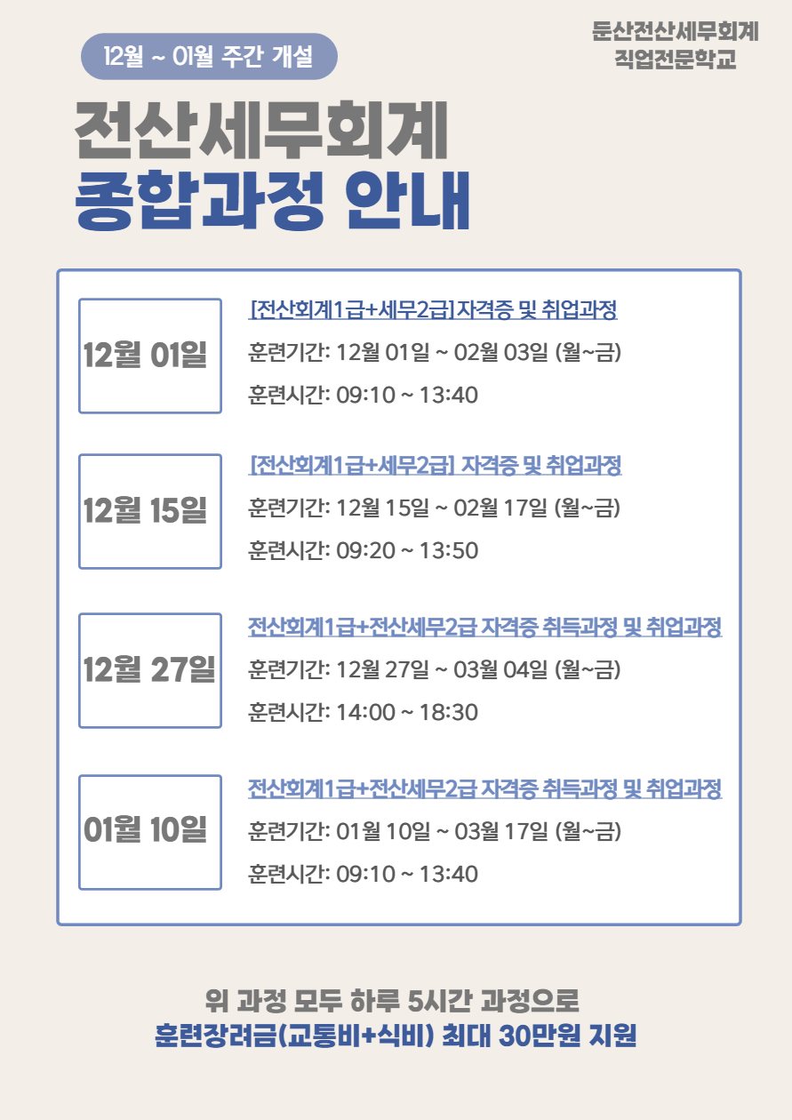 12월 ~01월 전산세무회계 종합과정을 아래와 같이 개설했습니다.