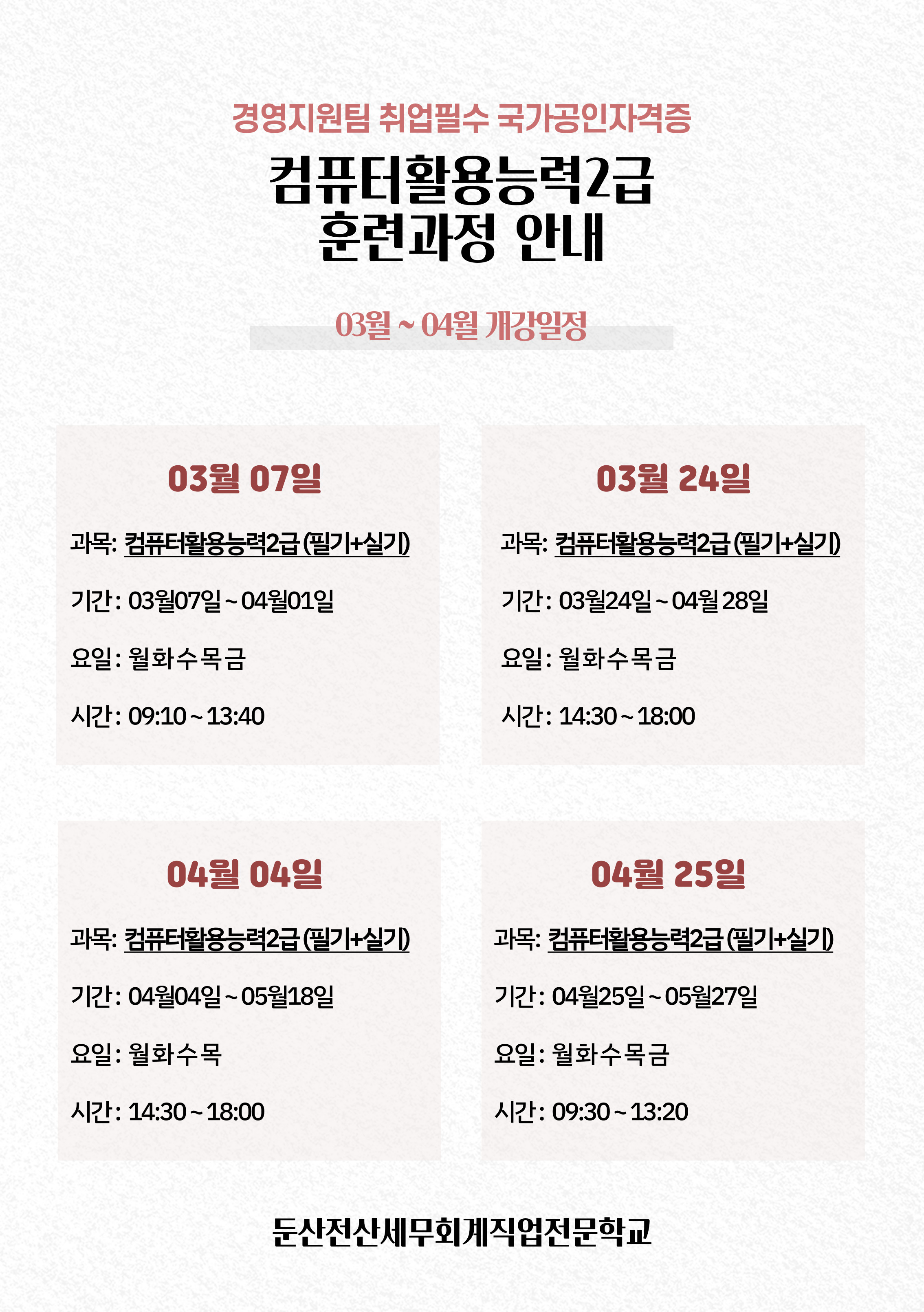 03월~04월 컴퓨터활용능력 과정을 아래와 같이 개설합니다.