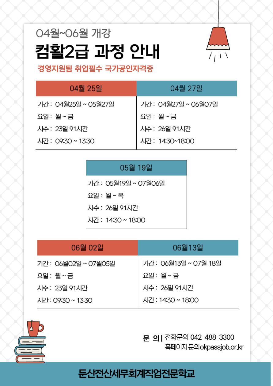 04월~06월 컴퓨터활용능력 과정을 아래와 같이 개설합니다.