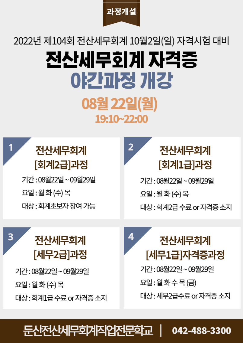 2022년 10월 02일(일)에 시행하는 제104회 전산세무회계 자격시험 대비 8월 야간과정을 개설하여