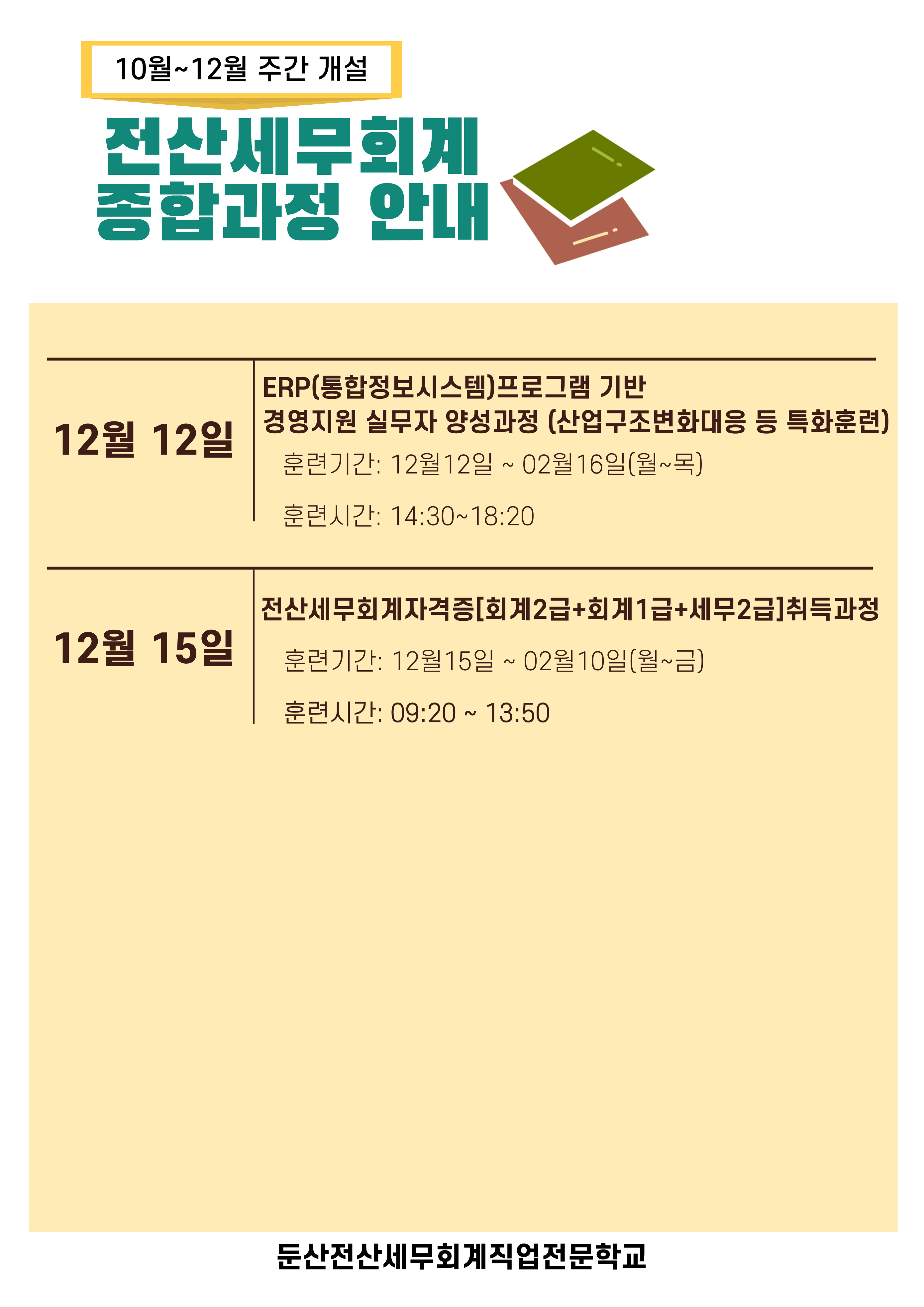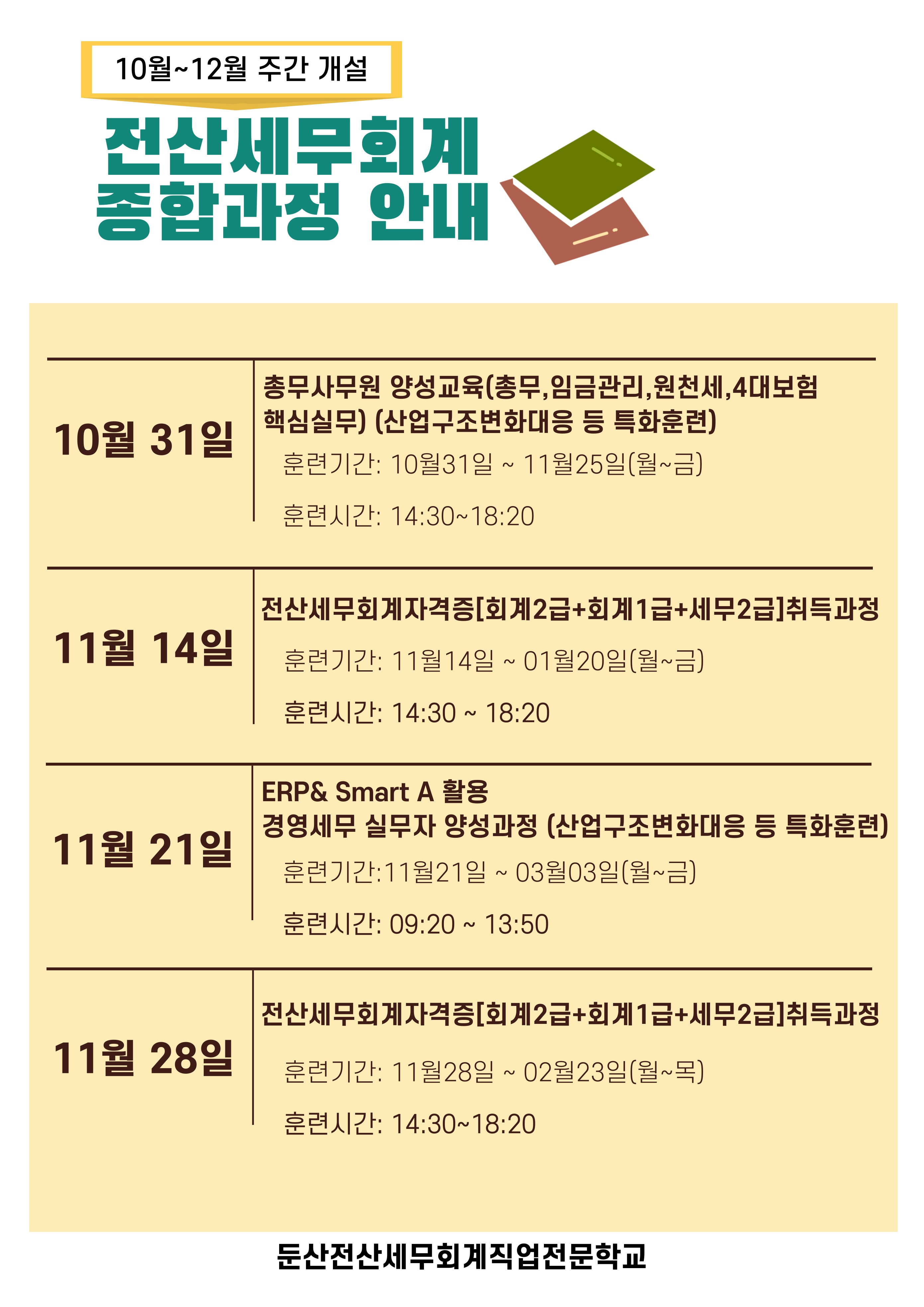 10월~12월 전산세무회계 종합과정을 아래와 같이 개설합니다.