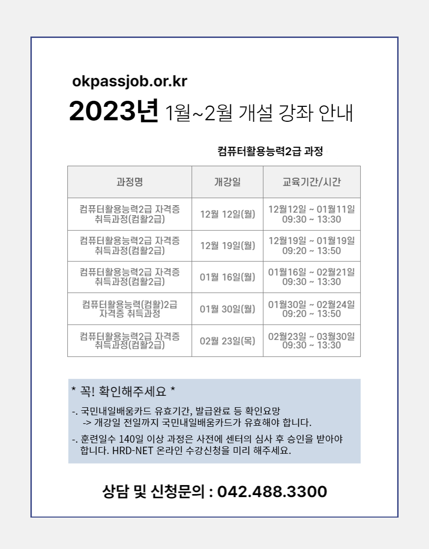 12월~02월 컴퓨터활용능력 과정을 아래와 같이 개설합니다.