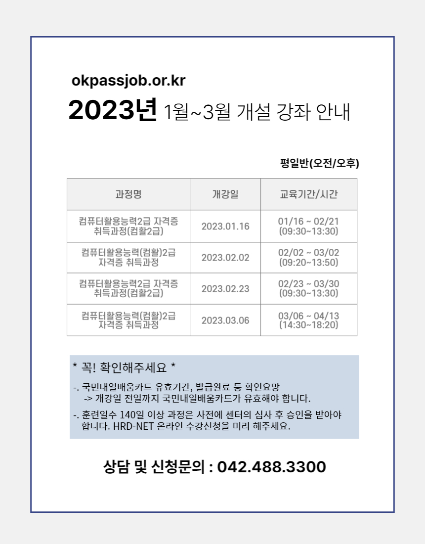 01월~03월 컴퓨터활용능력 과정을 아래와 같이 개설합니다.