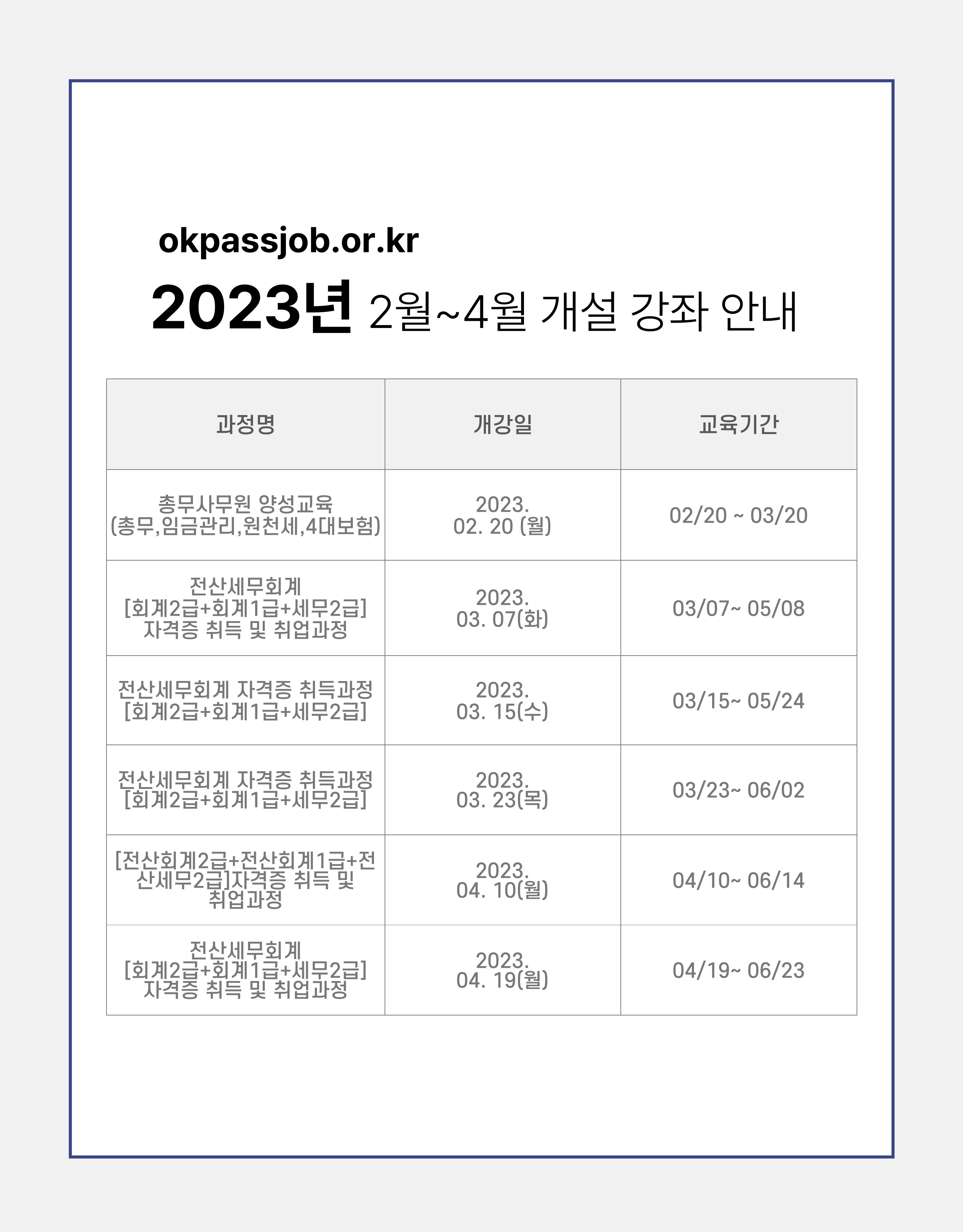 2023년 02월 ~ 2023년 04월 전산세무회계 종합과정을 아래와 같이 개설합니다.