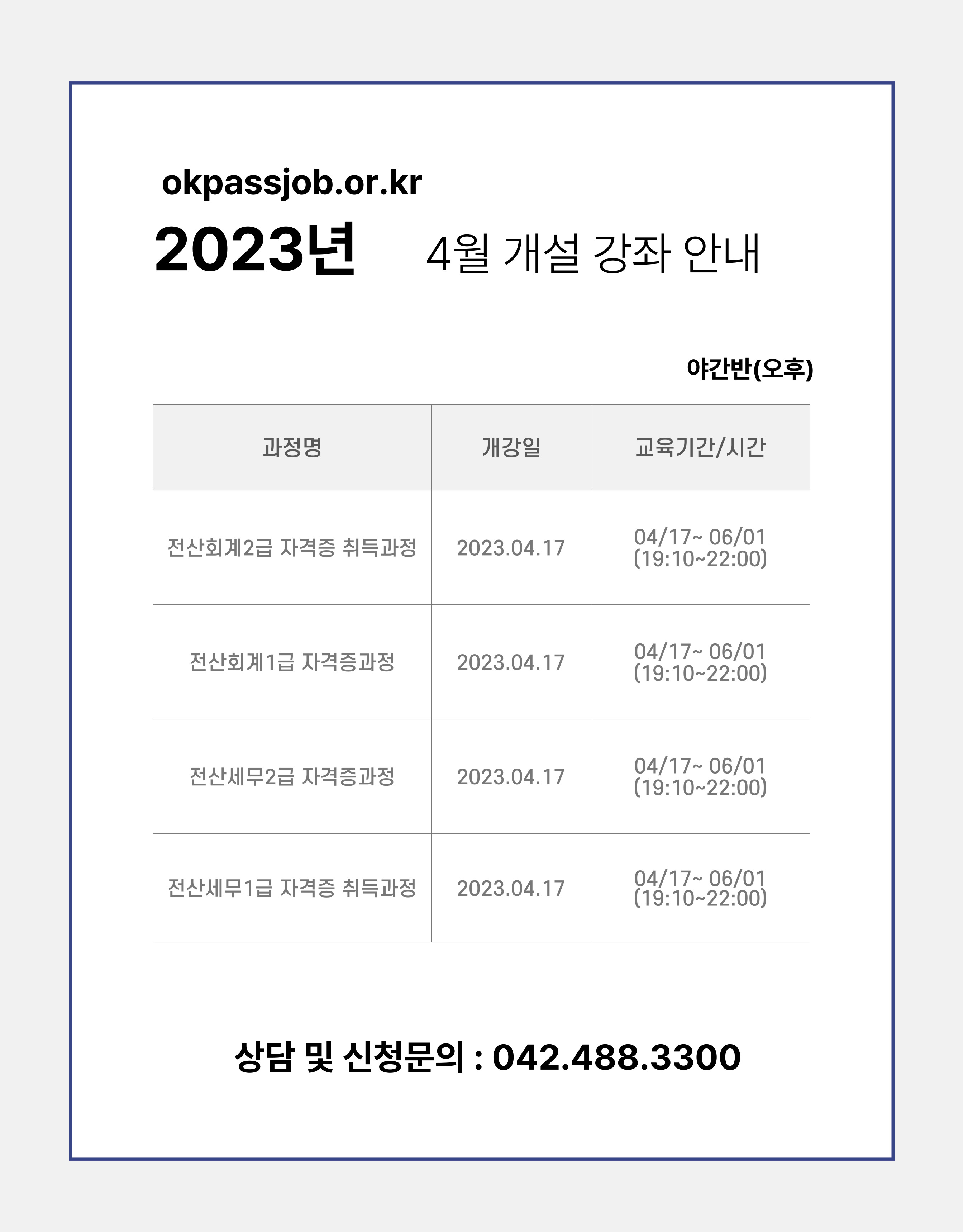 2023년 4월 전산세무회계 단과과정을 아래와 같이 개설합니다.