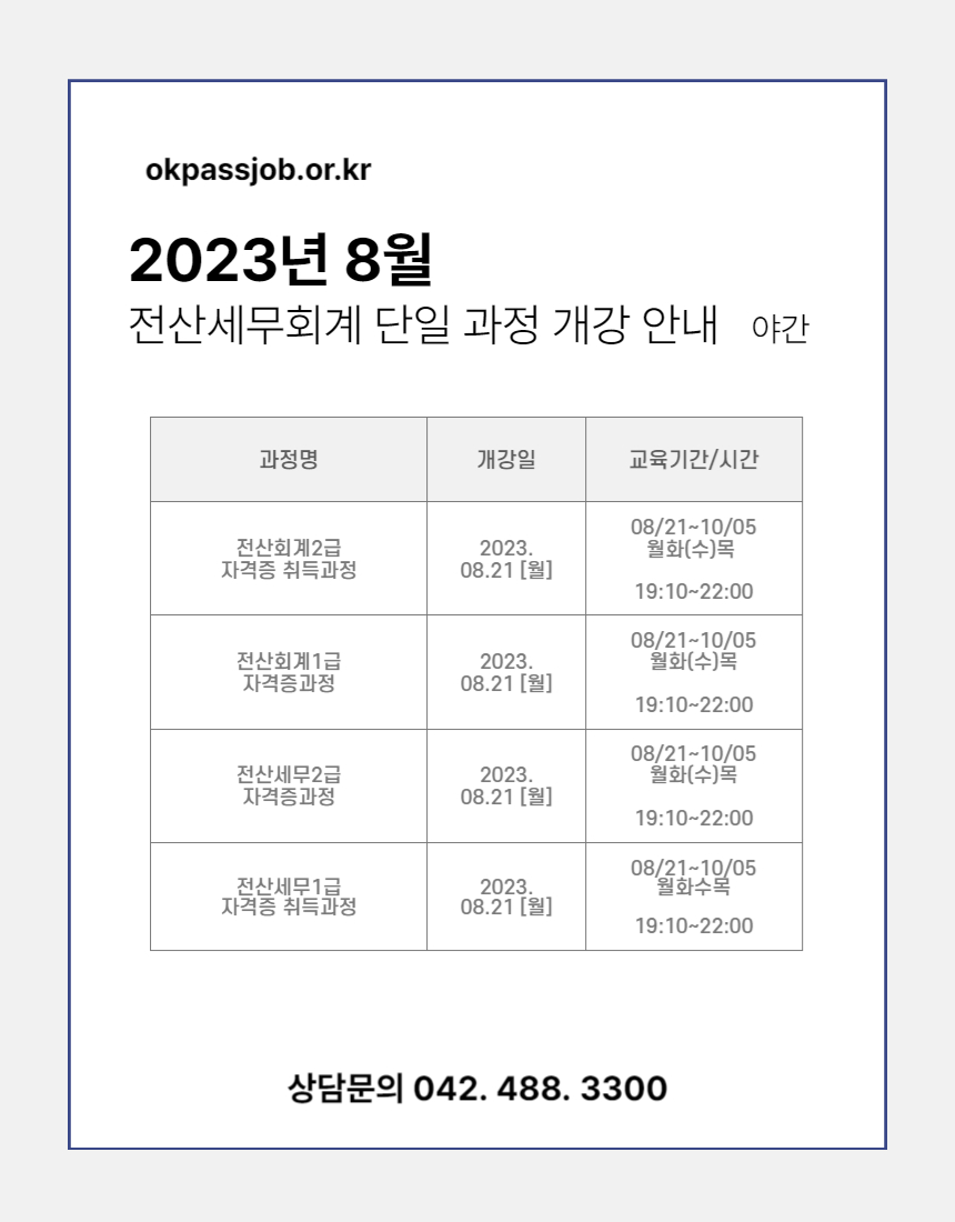 2023년 08월 전산세무회계 단과과정을 아래와 같이 개설합니다.