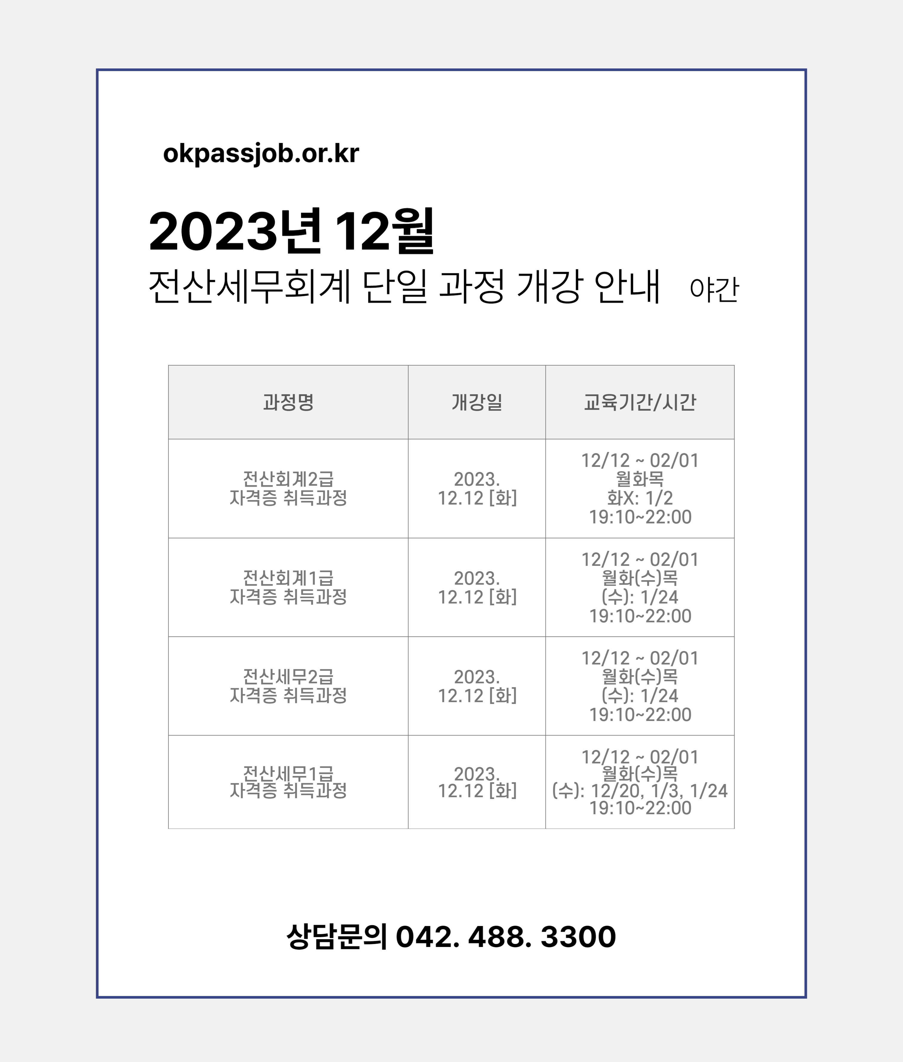 2023년 12월 전산세무회계 단과과정을 아래와 같이 개설합니다.