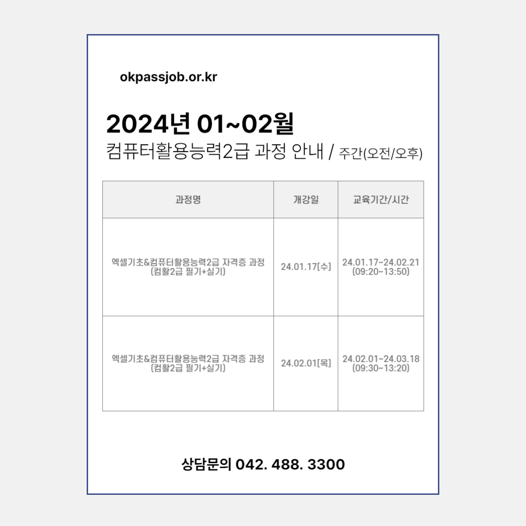 01월~02월 컴퓨터활용능력2급 과정을 아래와 같이 개설합니다.